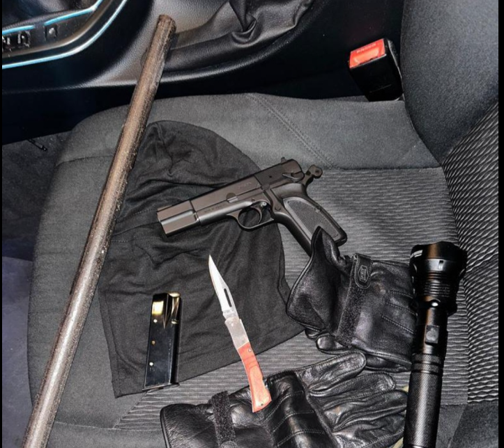 Siç thuhet në njoftim, policia ka ndaluar veturën e tij në një pikë kontrolli rreth orës 03:00, dhe gjatë kontrollit në veturën e tij janë gjetur dhe konfiskuar një armë e llojit pistoletë me 15 fishekë, një shufër metali, një palë dorëza, një kapelë maskë e zezë dhe një mjet i mprehtë brisk.