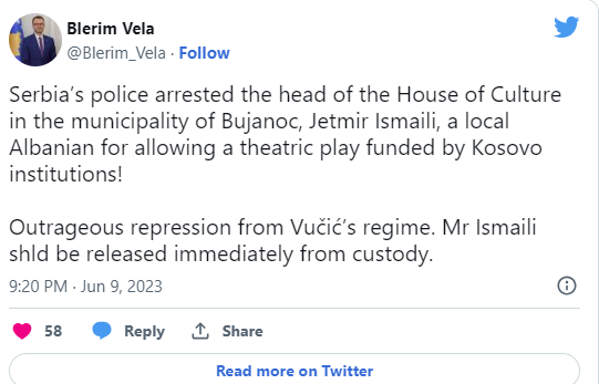 “Represion i egër nga regjimi i Vuçiqit. Z. Ismaili duhet të lirohet menjëherë nga paraburgimi”, shkroi Vela./Arbresh.info/