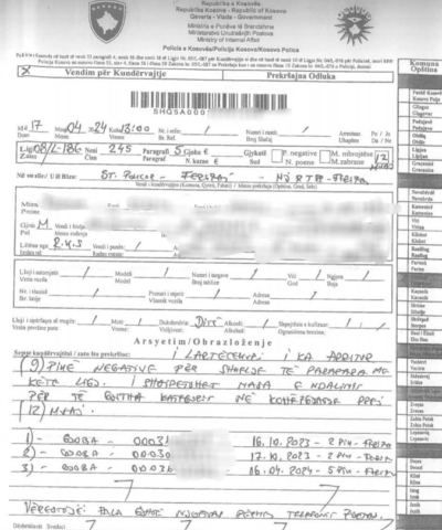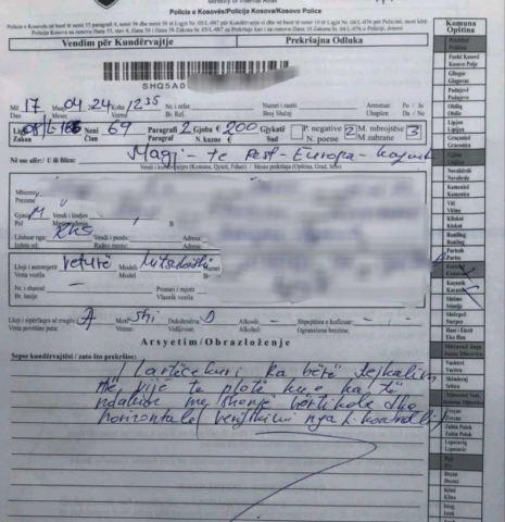 Ndaj tij policia i ka shqiptuar një gjobë kundërvajtëse prej 200 euro, 2 pikë negative dhe për 3 muaj masë mbrojtëse, heqje e patentë shoferit.
