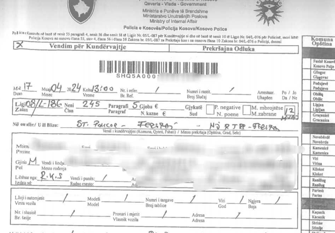 Ndaj tij policia i ka shqiptuar një gjobë kundërvajtëse prej 200 euro, 2 pikë negative dhe për 3 muaj masë mbrojtëse, heqje e patentë shoferit.