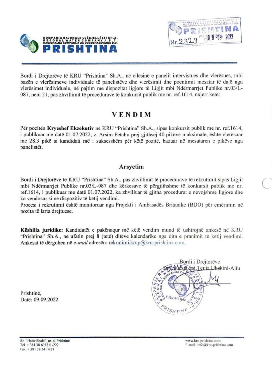 KRU “Prishtina” bënë të ditur se, Fetahu mori 28.3 pikë nga 40 gjithsej duke u vlerësuar si kandidati më i suksesshëm për këtë pozitë nga panelistët.