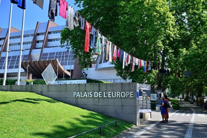 Dhjetëra fustane të varura në tela për tharjen e rrobave, dhuruar nga gra të mbijetuara të dhunës seksuale gjatë konflikteve të armatosura dhe nga figura publike në shenjë solidariteti, u shfaqën para ndërtesës së Këshillit të Evropës të enjten.