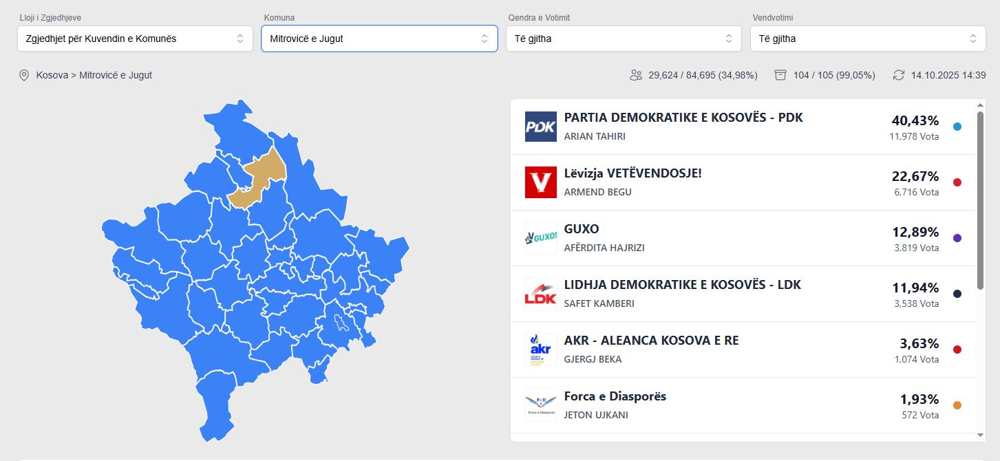 Procesi për Kuvendin Komunal në Mitrovicë të Jugut është drejt fundit, me numërimin e 99,05% të vendvotimeve të procesurara.