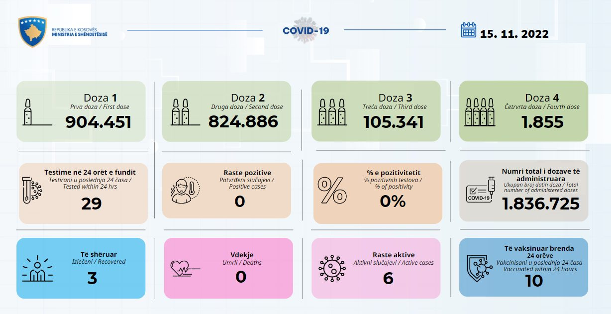 Gjatë 24 orëve të fundit në Kosovë nga 29 testime të kryera për Covid-19, asnjë qytetarë nuk ka rezultuar pozitivë.