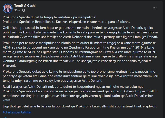“Prokuroria për të mos e manipuluar opinionin do të duhet fillimisht të tregoj se a kanë marrë gjurmë të ADN- së nga të burgosurit që kanë qenë në Qendrën e Paraburgimit në Prizren më 05.11.2016, a kanë marrë gjurmë të ADN- së i gjithë stafi i Qendrës së Paraburgimit në Prizren, a kanë marrë gjurmë të ADN-së nga ana e gardianëve dhe policëve të cilët Astrit Deharin e kanë nxjerrë të gjallë – me shenja jete e nga Qendra e Paraburgimit në Prizren dhe të vdekur – pa shenja jete e kanë dërguar në spitalin rajonal të Prizrenit”, ka shkruar Gashi në rrjetin social në Facebook.