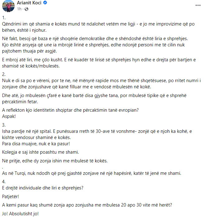 “Nuk e di sa po e vëreni, por te ne, në mënyrë rapide mos me thënë shqetësuese, po rritet numri i zonjave dhe zonjushave që kanë filluar me e vendosë mbulesën në kokë. Dhe atë, jo mbulesën çfarë e kanë bartë disa gjyshe tana, por mbulesë tipike që e shpreh përcaktimin fetar”, ka shkruar avokati Koci.