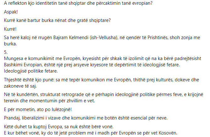 “Mungesa e komunikimit me Evropën, kryesisht për shkak të izolimit që na ka bërë padrejtësisht Bashkimi Evropian, është një prej arsyeve kryesore të depërtimit të ideologjisë fetare. Ideologjisë politike fetare. Thjesht është kjo punë: sa më tepër komunikon me Europën, thith prej kulturës, dokeve dhe zakoneve të saj. Në të kundërtën, strukturat retrograde që e përhapin ideologjinë politike përmes feve, e krijojnë terrenin dhe momentumin për zhvillim e vet. E për momentin, ato po lulëzojnë! Prandaj, liberalizimi i vizave dhe komunikimi me botën është esencial për neve. Këtë duhet ta kuptojë Evropa, sa nuk është bërë vonë. E kur bëhet vonë, ky do të jetë problem më i madh për Evropën se për vetë Kosovën”, ka thënë në fund Arianit Koci./arbresh.info/
