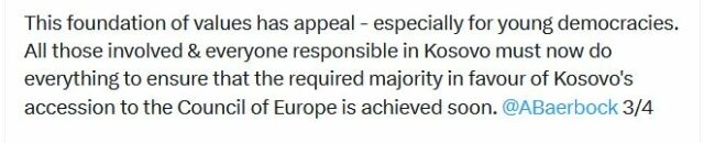 “Ky themel i vlerave ka tërheqje – veçanërisht për demokracitë e reja. Të gjithë të përfshirët dhe të gjithë përgjegjës në Kosovë tani duhet të bëjnë gjithçka për të siguruar që shumica e kërkuar në favor të anëtarësimit të Kosovës në Këshillin e Evropës të arrihet së shpejti”, tha ajo.