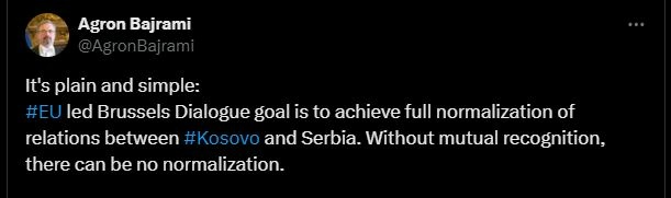 “Qëllimi i dialogut të Brukselit të udhëhequr nga BE është të arrihet normalizimi i plotë i marrëdhënieve ndërmjet Kosovës dhe Serbisë. Pa njohje reciproke, nuk mund të ketë normalizim./rtk