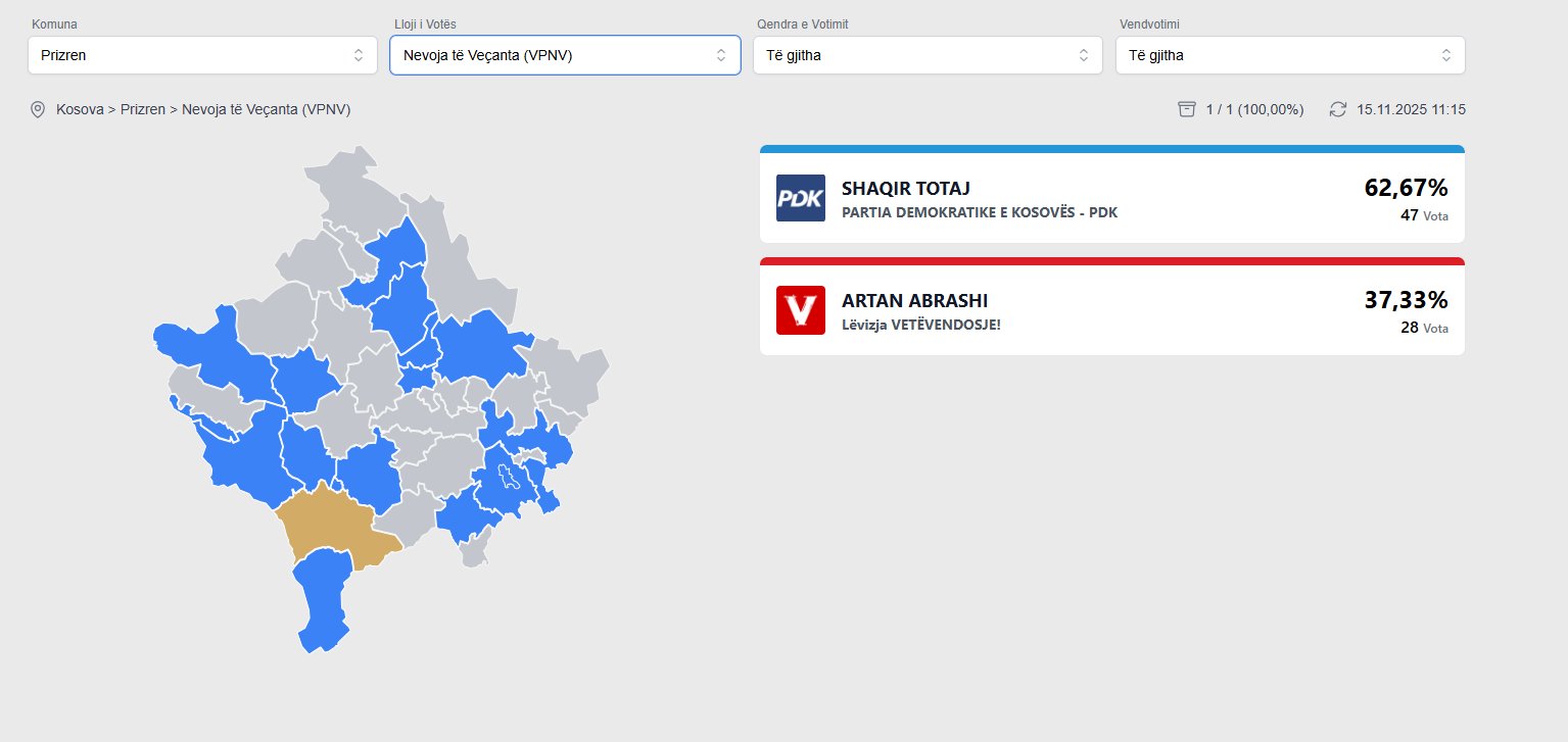 Sipas rezultateve, Shaqir Totaj nga PDK-ja ka marrë 47 vota nga personat me nevoja të veçanta, ndërsa Artan Abrashi i VV-së ka marrë 28 vota.