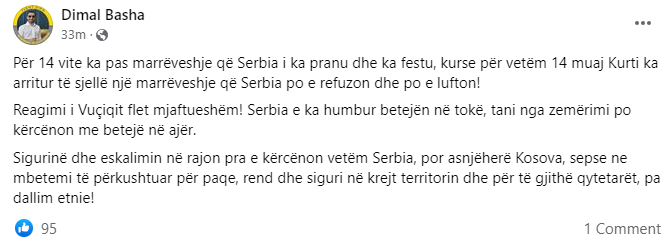 Me anë të një postimi në Facebook, Basha ka thënë se Kurti për 14 muaj e solli një marrëveshje që Serbia po e refuzon dhe po lufton, teksa sipas tij në 14 vitet e kaluara kishte marrëveshje që Serbia i pranonte dhe festonte, shkruan arbresh.info.