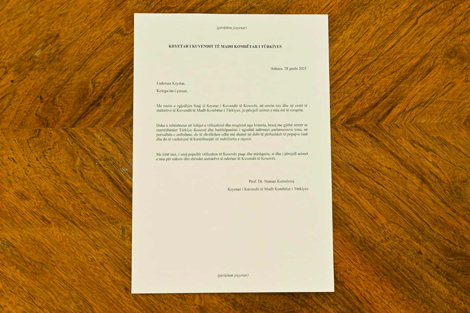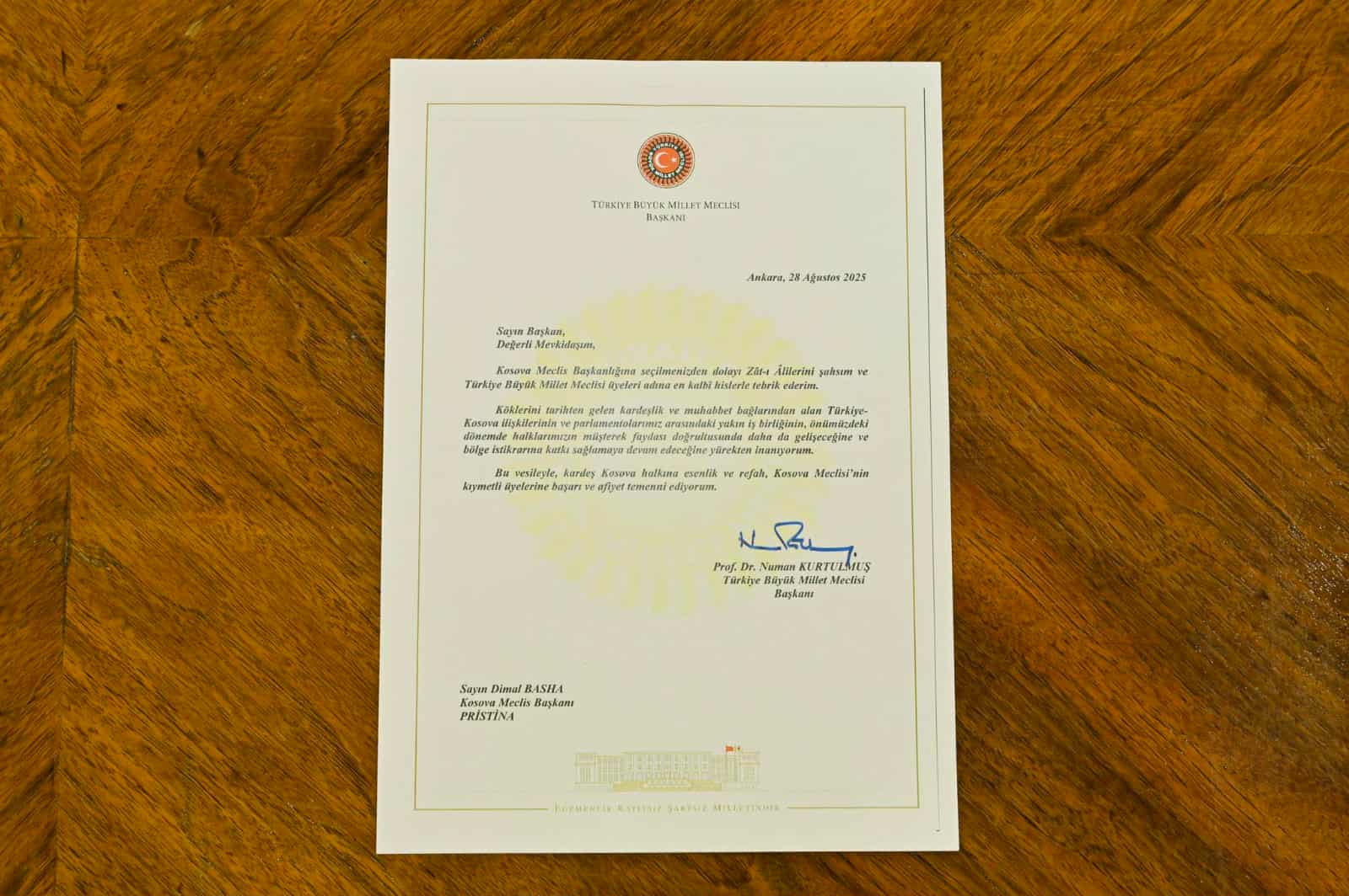 Në mesazhin e tij, Kryetari Kurtulmuş shprehu “urimet për popullin vëllazëror të Kosovës për paqe dhe mirëqenie, duke i përcjellë gjithashtu urimet për sukses dhe shëndet për anëtarët e nderuar të Kuvendit të Kosovës”.