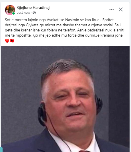 Në një postim në Facebook, ajo ka shkruar se lajmi është konfirmuar nga Avokati i Haradinaj, shkruan Arbresh.info