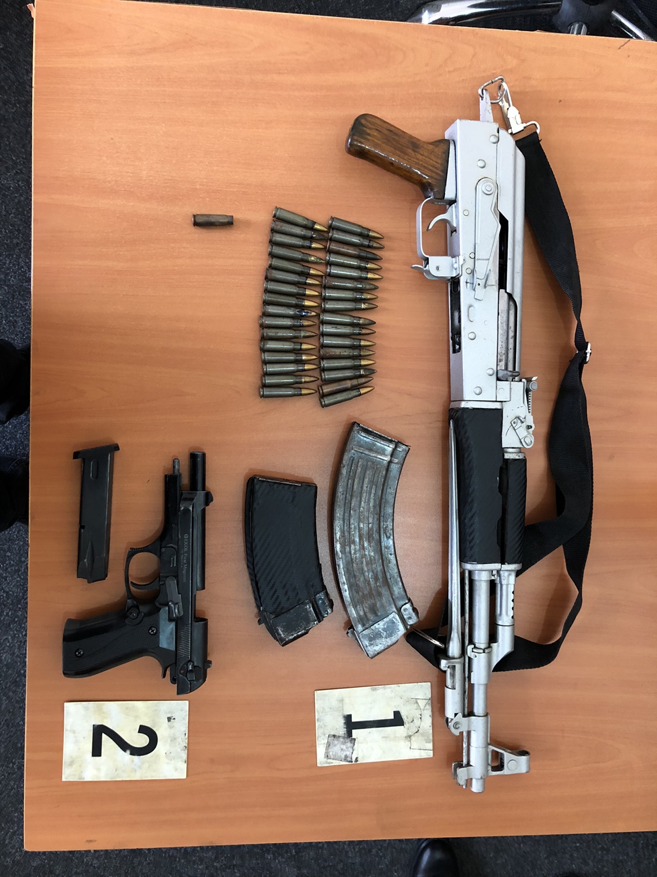 Gjatë kontrollit në fshatin Drenoc, në posedim të të dyshuarit J.K., i lindur në vitin 1993, shtetas i Republikës së Kosovës, janë gjetur një AK47 me dy karikatorë dhe 32 copë fishekë si dhe një pistoletë EKOL FIRAT Magnum 9mm dhe një gëzhojë e kalibrit 7.62mm., të cilat janë sekuestruar si prova materiale.