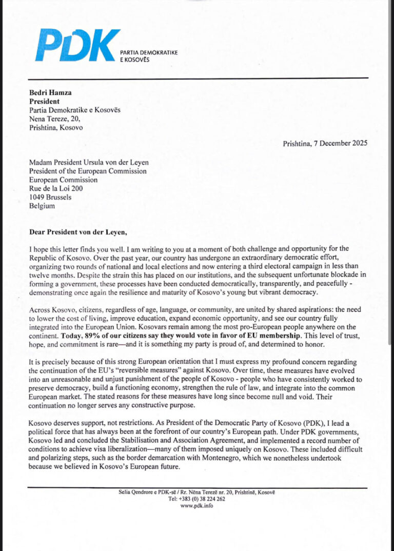 Kryetari i Partisë Demokratike të Kosovës (PDK), Bedri Hamza, ia ka dërguar një letër zyrtare presidentes së Komisionit Europian, Ursula von der Leyen, ku kërkon heqjen e menjëhershme dhe të pakushtëzuar të masave të BE-së ndaj Kosovës. Në tekstin e letrës bie në sy një qasje që shkon përtej interesit partiak dhe zgjedhor, duke e vendosur perspektivën europiane të Kosovës mbi çdo rivalitet politik.