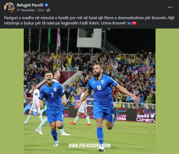 “Pasiguri e madhe në minutat e fundit por më në fund një fitore e domosdoshme për Kosovën. Një mbrëmje e bukur për të nderuar legjendën Fadil Vokrri. Urime Kosovë! ??❤️”, shkruan Pacolli./arbresh.info/