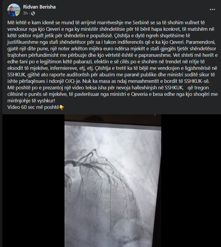 “Paramendoni, gjatë një dite pune, një noter arkëton mijëra euro ndërsa mjekët e stafi gjegjës tjetër shëndetësor trajtohen përfundimisht me përbuzje dhe kjo vërtetë është e papranueshme. Vet shteti më herët e edhe tani po e legjitimon këtë pabarazi, efektin e së cilës po e shohim në trendet në rritje të eksodit të mjekëve, infermiereve, etj, etj. Çështja e tretë ka të bëjë me vendosjen e ligjshmërisë në SSHKUK, gjithë ato raporte auditorësh për abuzim me paranë publike dhe ministri soditë sikur të ishte përfaqësues i ndonjë OJQ-je. Nuk ka masa as ndaj menaxhmentit e bordit të SSHKUK-së”, shkruan ai./arbresh.info/