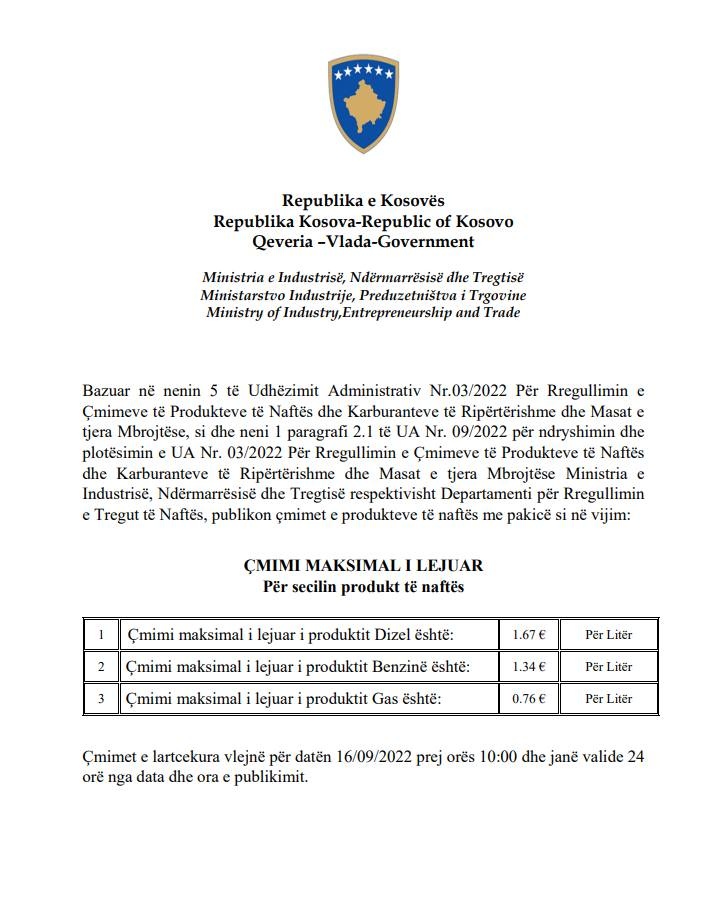 Ministria e Industristrisë, Ndërmarrësisë dhe Tregtisë ka publikuar çmimin për derivatet e naftës në 24 orët e ardhshme.