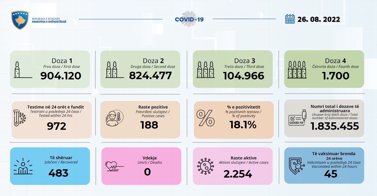 Ministria e Shëndetësisë bën të ditur se në 24 orët e fundit janë shënuar 188 raste të reja me Covid-19 në Kosovë.
