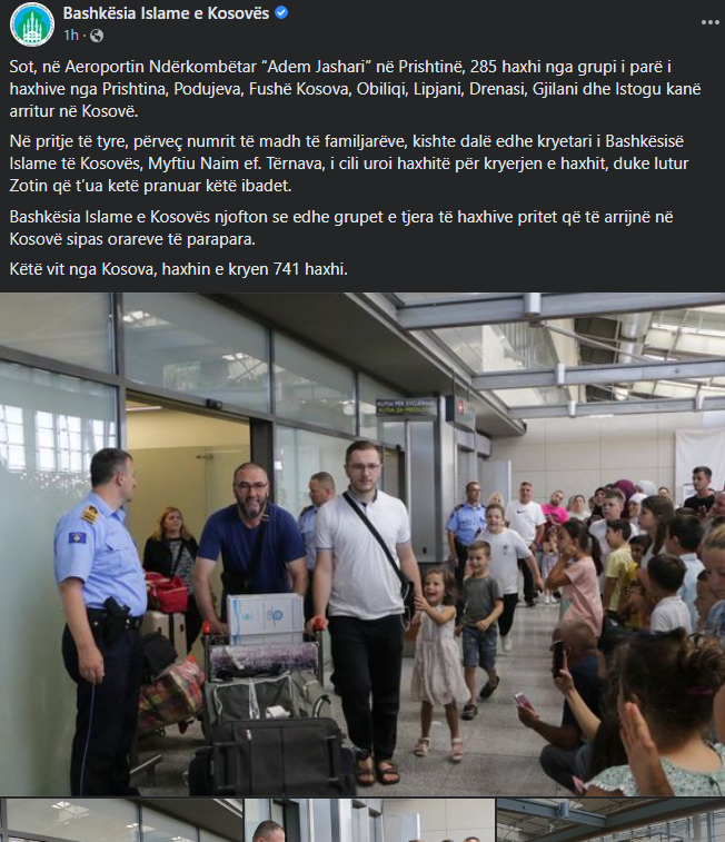Bashkësia Islame e Kosovës njofton se sot 285 haxhi nga grupi i parë i haxhive nga Prishtina, Podujeva, Fushë Kosova, Obliqi, Lipjani, Drenasi, Gjilani dhe Istogu kanë arritur në Kosovë, shkruan arbresh.info.