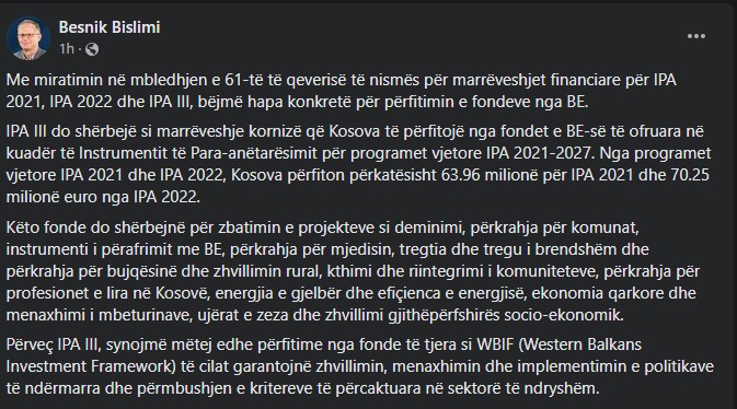 “Me miratimin në mbledhjen e 61-të të qeverisë të nismës për marrëveshjet financiare për IPA 2021, IPA 2022 dhe IPA III, bëjmë hapa konkretë për përfitimin e fondeve nga BE. IPA III do shërbejë si marrëveshje kornizë që Kosova të përfitojë nga fondet e BE-së të ofruara në kuadër të Instrumentit të Para-anëtarësimit për programet vjetore IPA 2021-2027. Nga programet vjetore IPA 2021 dhe IPA 2022, Kosova përfiton përkatësisht 63.96 milionë për IPA 2021 dhe 70.25 milionë euro nga IPA 2022”, ka shkruar ai në Facebook.