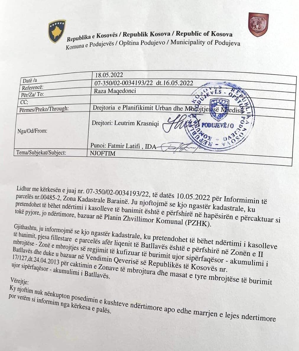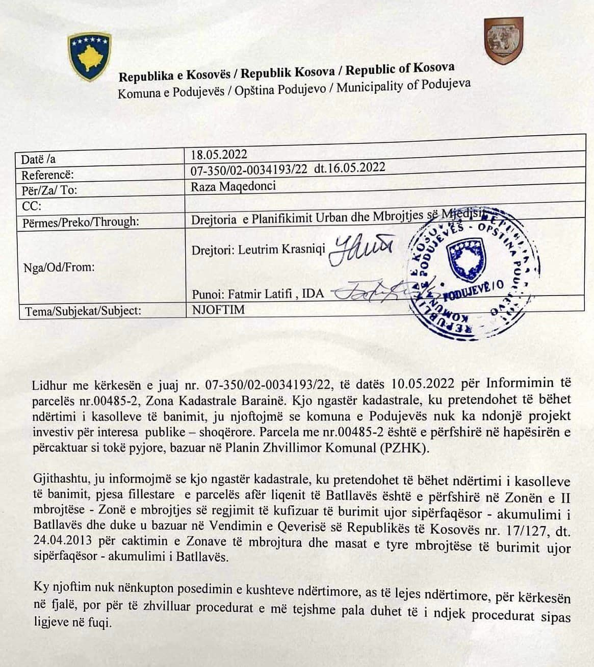Blend Zymi publikon dokumentin e një skandali që implikon drejtorin e Urbanizmit në Komunën e Podujevës