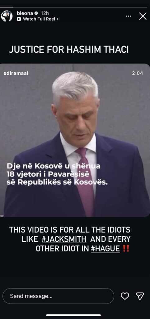 Në një postim në Instagram, artistja tha se videoja e shpërndarë ku Thaçi flet, është për të gjithë “idiotët si Jack Smith dhe të tjerët që janë në Hagë”.