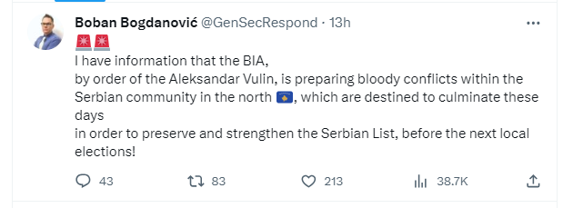 Sekretar i Përgjithshëm i Institutit për Strategjinë Euro-Atlantike, Boban Bogdanoviç, në një reagim në rrjetin social “X”, ka thënë se Shërbim Sekret i Serbisë i komanduar nga Aleksandër Vulin është duke përgatitur një “sulm” të përgjakshëm në veri të Kosovës.
