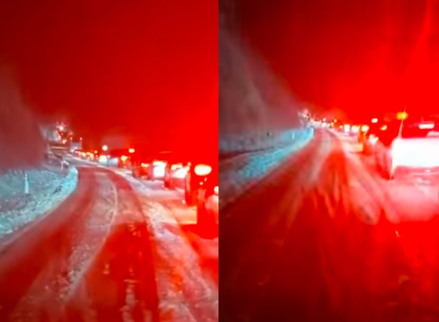 Në disa pamje të publikuara në mediat online shihen kolonat e gjata që kanë lënë të bllokuar disa bashkatdhetarë pasi kaluan kufirin në Merdarë, ndërkohë që reshjet e borës vazhdojnë.