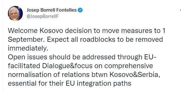 “Mirëpresim vendimin e Kosovës për zhvendosjen e masave deri më 1 shtator. Pres që të gjitha bllokimet e rrugëve të hiqen menjëherë”, ka shkruar Borrell në Twitter.