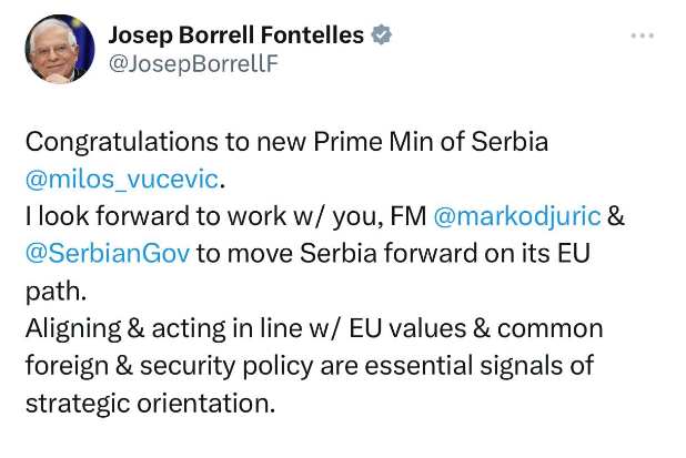 “Urime kryeministrit të ri të Serbisë, Millosh Vuçeviq. Mezi pres të punoj me ju, ministrin e Jashtëm Marko Gjuriq dhe Qeverinë serbe, për ta çuar Serbinë përpara në rrugën e saj drejt BE-së”, ka shkruar Borrell në platformen “X”.