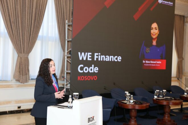 Banka Qendrore e Republikës së Kosovës (BQK) me mbështetjen e Bankës Evropiane për Rindërtim dhe Zhvillim (BERZH) dhe Shkollës së Frankfurtit për Financa dhe Menaxhim, ka lansuar përmes një konference nismën për mbështetjen e qasjes në financa për gratë ndërmarrëse “WE Finance Code”. Ky projekt do të ketë ndikim të qëndrueshëm në ghithëpërfshirjen financiare në vendin tonë, në pajtim me orientimet strategjike të BQK-së. Punimet e kësaj konference i nderoi dhe mbështeti me pjesëmarrjen e saj shkëlqesia e saj Presidentja e Republikës znj. Vjosa Osmani Sadriu, me një fjalë përshëndetëse.