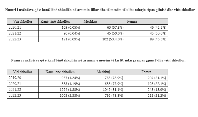 Arbresh.info ka dërguar pyetje në Ministrinë e Arsimit, Shkencës, Teknologjisë dhe Inovacionit, me ç’rast ka pranuar statistikat zyrtare të braktisjes së shkollimit gjatë tri viteve të fundit të cilat mund t’i gjeni në vazhdim.