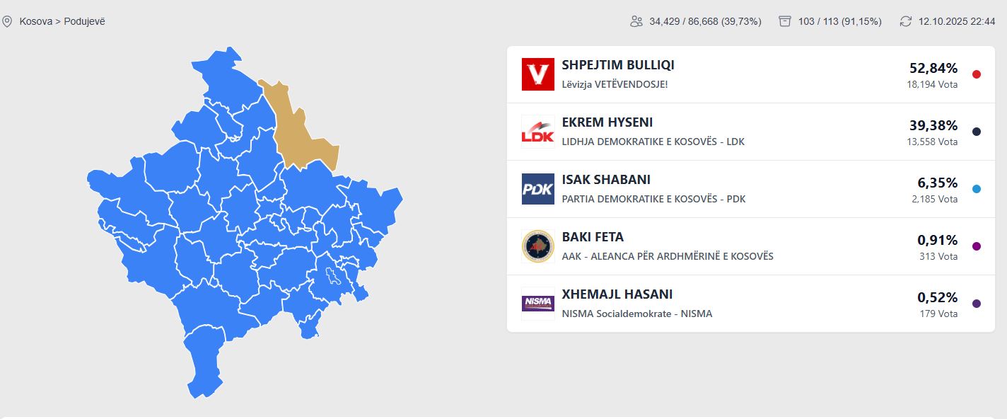 Kandidati i Lëvizjes Vetëvendosje për kryetar të Podujevës, Shpejtim Bulliqi, është drejt fitores pa balotazh edhe për një mandat në krye të komunës.