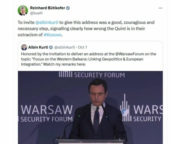 Bütikofer ka vlerësuar inkurajuese pjesëmarrjen e Kurtit në Forumin Varshavës me temë ‘Fokusi në Ballkanin Perëndimor: Lidhja e Gjeopolitikës dhe Integrimit Evropian’.