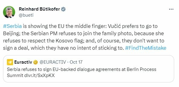 Deputetit gjerman, Reinhard Butikofer, e ka kritikuar qëndrimin në Kinë i presidentit serb, Aleksandër Vuçiq në një kohë kur në Tiranë u mbajt samiti i Procesit të Berlinit. Sipas tij, me veprime të tilla, Vuçiqi po ia tregon gishtin e mesit Bashkimit Evropian.