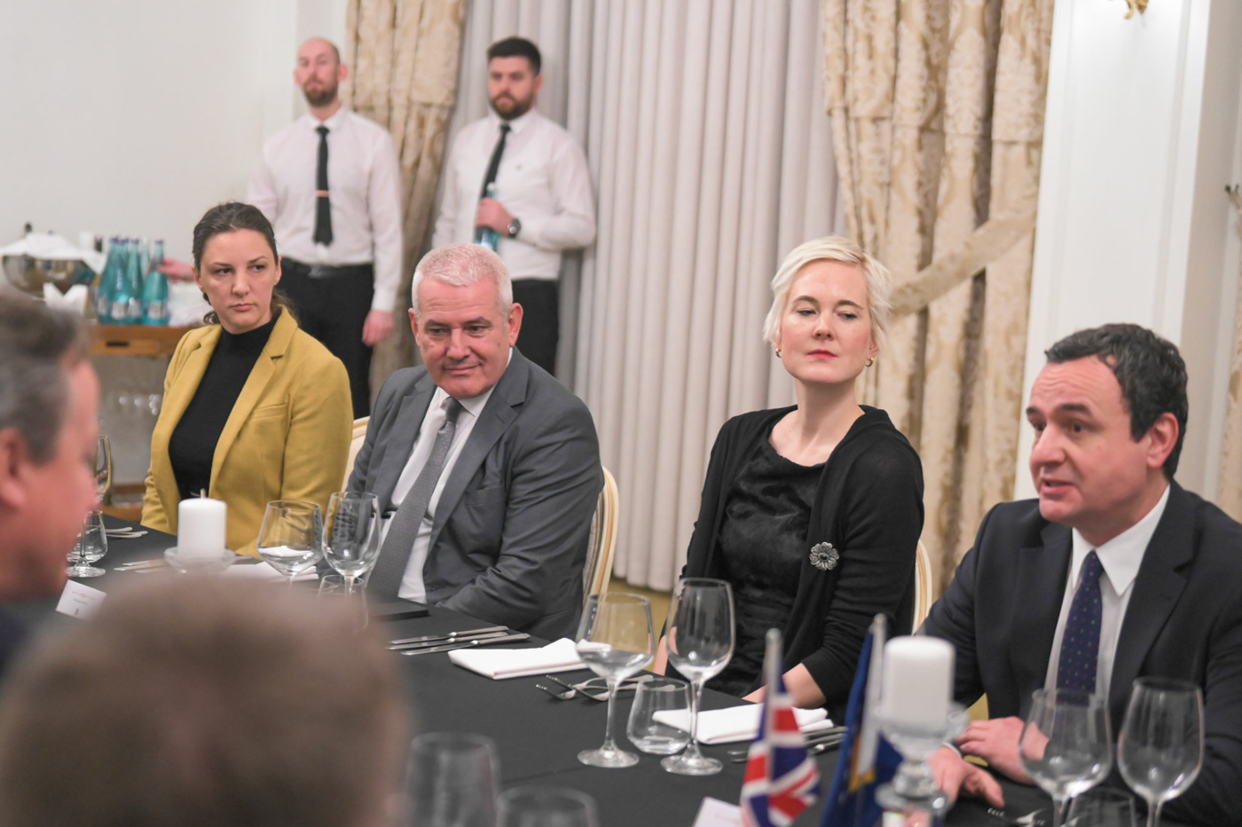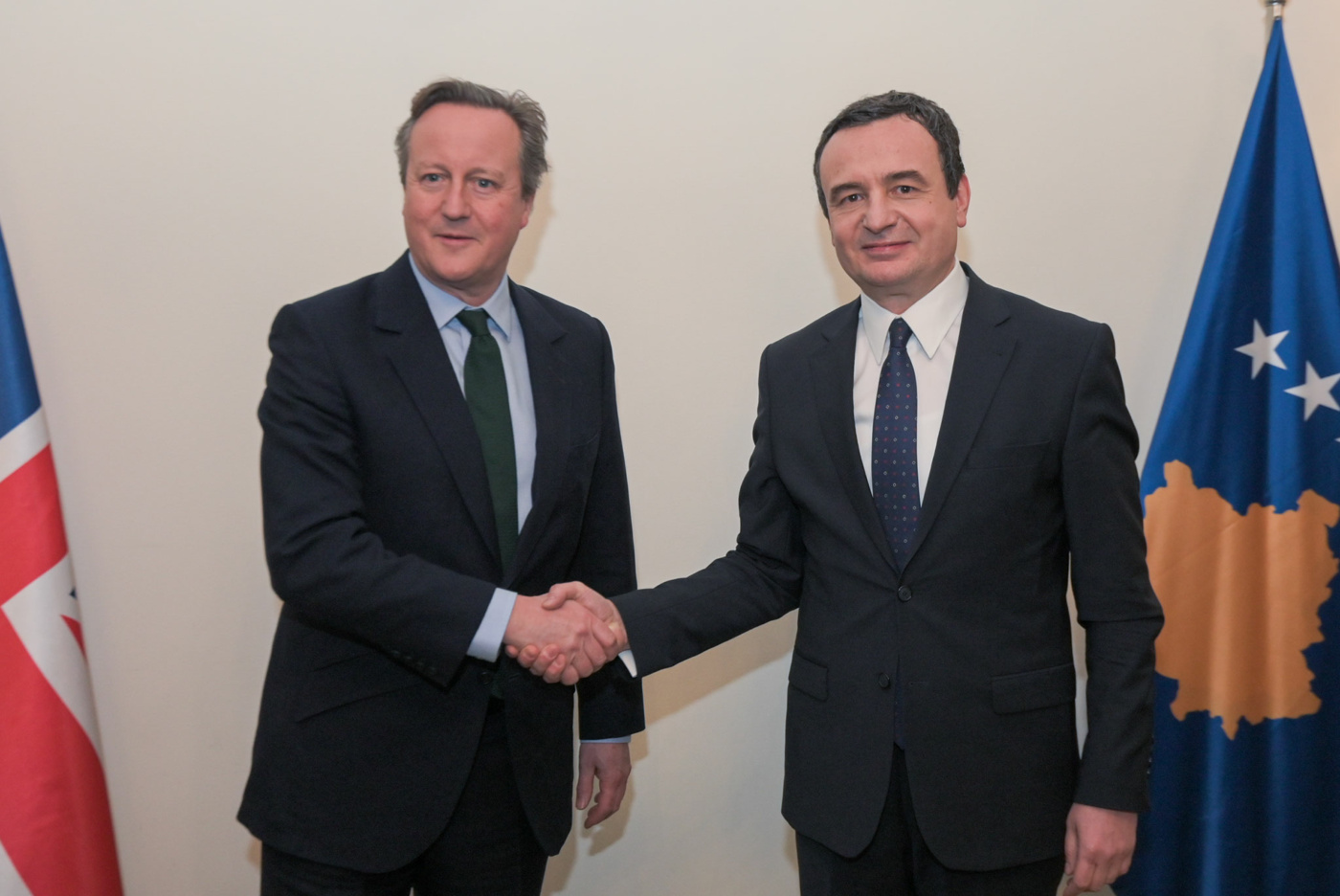 I shoqëruar nga zëvendëskryeministrja dhe ministrja e Punëve të Jashtme dhe Diasporës, Donika Gërvalla-Schëarz, ministri i Punëve të Brendshme, Xhelal Sveçla, ministrja e Ekonomisë, Artane Rizvanolli, ministri për Komunitete dhe Kthim, Nenad Rashiq, Kryetarja e Grupit Parlamentar të Lëvizjes VETËVENDOSJE!, Mimoza Kusari Lila dhe ambasadori i Kosovës në Mbretëri të Bashkuar, Ilir Kapiti, Kryeministri Kurti i uroi mirëseardhje të veçantë në Prishtinë, Sekretarit Cameron.