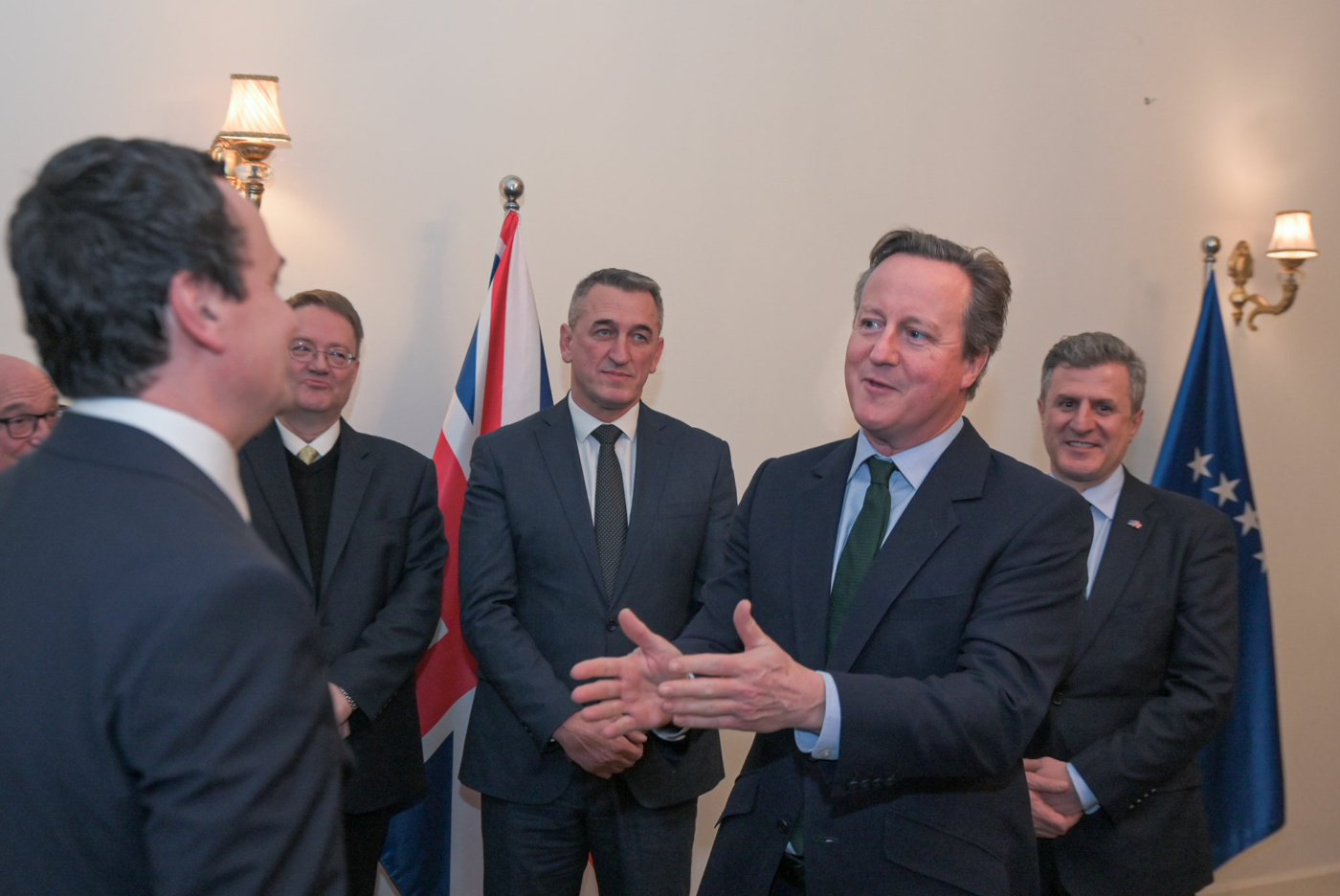 Në Prishtinë, Sekretari Cameron po shoqërohej nga i dërguari i Posaçëm i Mbretërisë së Bashkuar për Ballkanin Perëndimor, Lord Stuart Peach dhe ambasadori britanik në Kosovë, Nicholas Abbott./Arbresh.info/