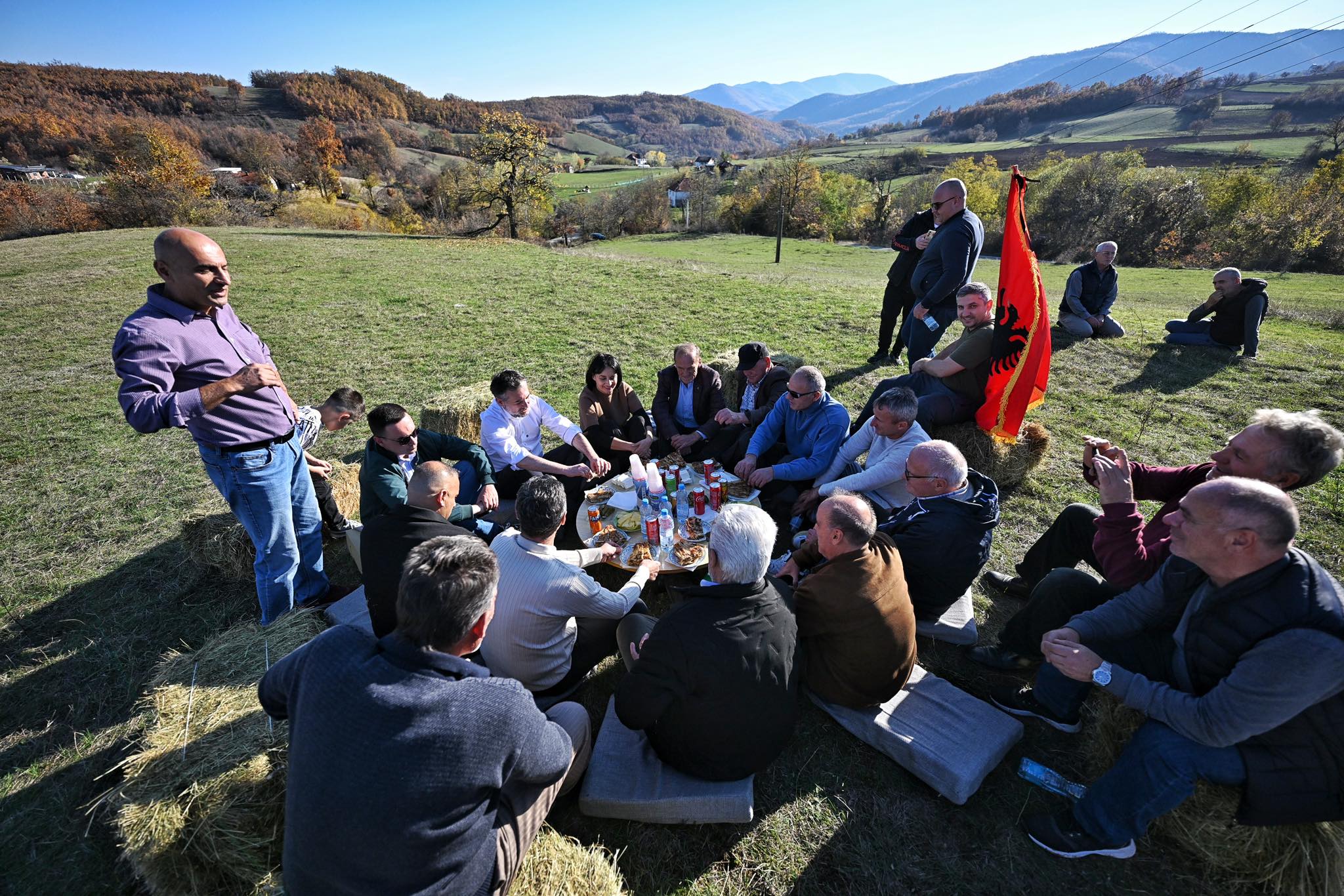 Në fotografi shihet një atmosferë e ngrohtë dhe mikpritëse, teksa banorët e presin kandidatin me ushqim tradicional.