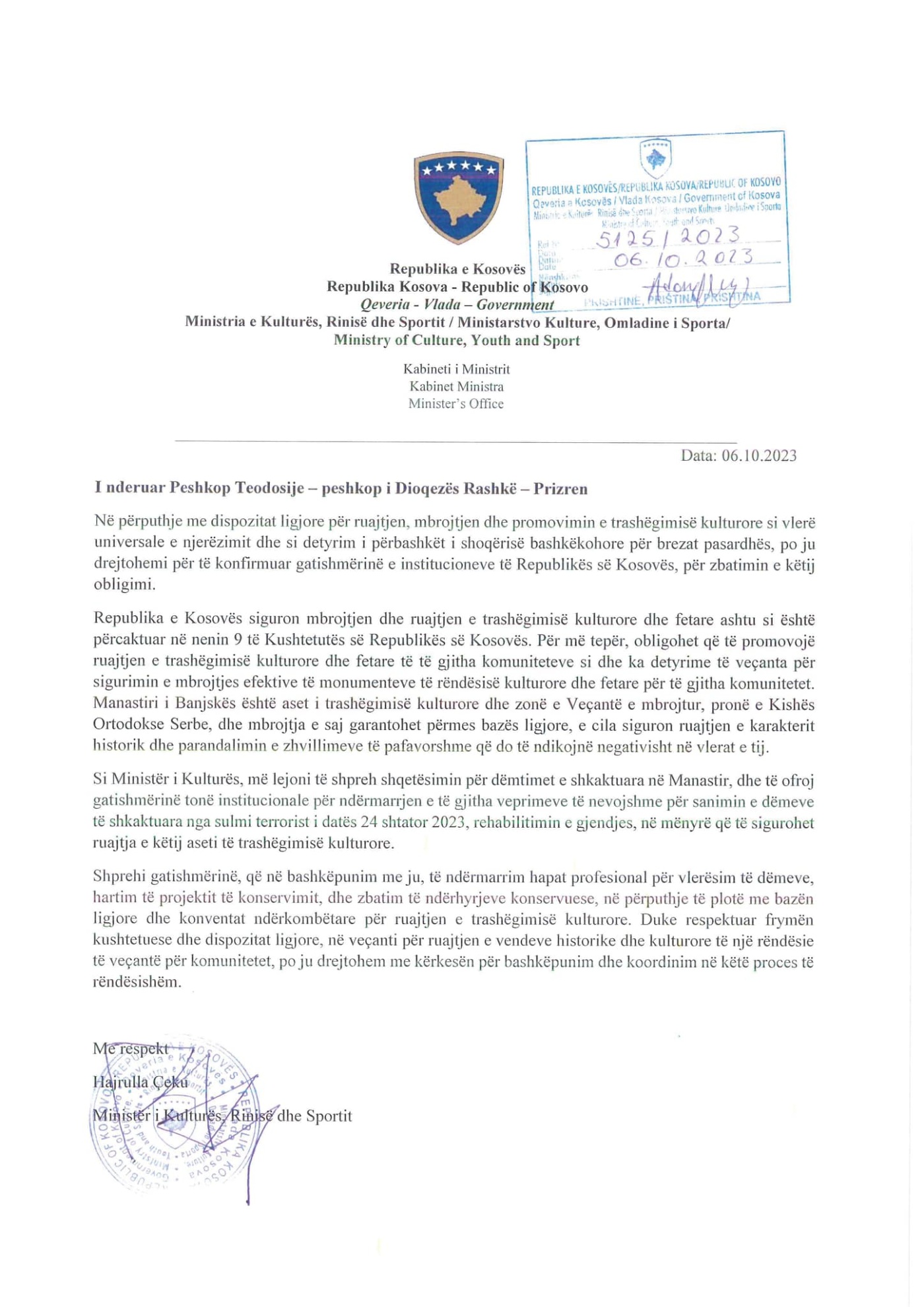 “Zotimin e dhënë në mbledhjen e Qeverisë së Kosovës të datës 27 shtator 2023 për sanimin e dëmeve në Manastirin e Banjskës në Zveçan, të shkaktuara nga sulmi terrorist i datës 24 shtator, po e konkretizojmë më shkresën zyrtare drejtuar Dioqezës Rashkë – Prizren. Konform detyrimeve, autorizimeve kushtetuese dhe ligjore ftojmë autoritetet e Kishës Ortodokse Serbe në Kosovë për bashkërendim të veprimeve deri në ndërhyrjet e nevojshme restauruese për sanimin e dëmeve në këtë aset të trashëgimisë kulturore”, ka shkruar Çeku./Arbresh.info