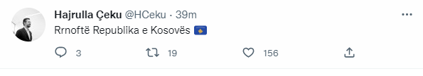 “Rrnoftë Republika e Kosovës”, ka shkruar Çeku në Twitter.