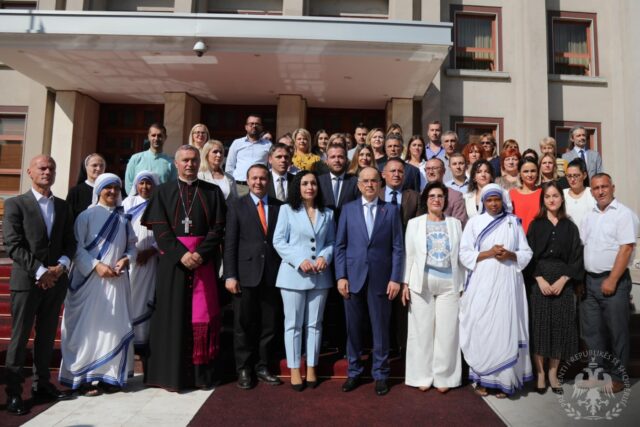 Presidenti i Republikës, Bajram Begaj, i shoqëruar edhe nga Presidentja e Republikës së Kosovës, Vjosa Osmani Sadriu, nderuan sot Ditën e Shenjtërimit të Shenjt Terezës, me çeljen e një ekspozite kushtuar figurës së saj, që u hap në ambientet e jashtme të Institucionit të Presidentit.