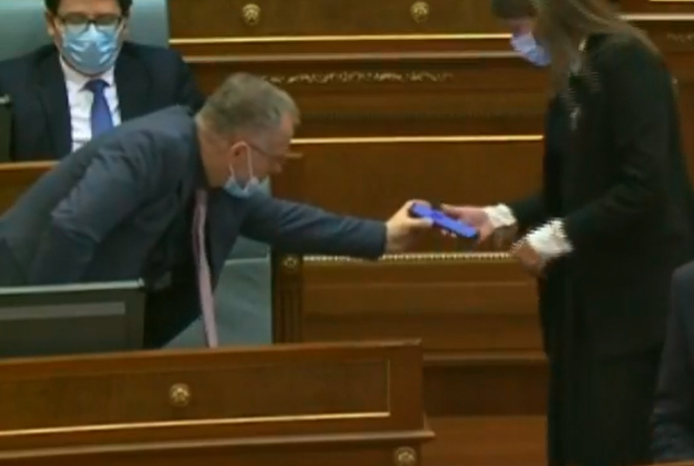 Ministrja e Drejtësisë, Albulena Haxhiu, ka mbetur e shtangur për disa minuta në seancën e sotme të Kuvendit. Kjo pasi zëvendëskryeministri, Besnik Bislimi, e thirri dhe i tregoi diçka në telefonin e tij.