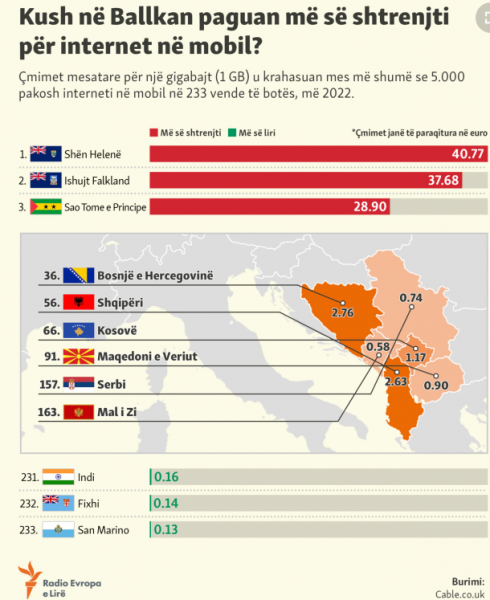 Çmimet mesatare për një gigabajt (1GB) u krahasuan mes më shumë se 5 mijë pakosh internet në mobil në 233 vende të botës, më 2022.