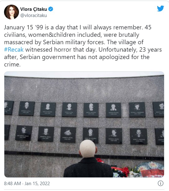 “15 janari i vitit 1999 është një ditë që gjithmonë do ta kujtoj. 45 civilë, përfshirë gra dhe fëmijë, u masakruan brutalisht nga forcat ushtarake serbe. Fshati i Reçakut u bë dëshmitar i një tmerri atë ditë. Fatkeqësisht, 23 vjet më pas, qeveria serbe nuk ka kërkuar falje për krimet”, ka shkruar Çitaku në Twitter./arbresh.info/