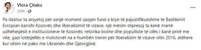 “Pa dashur ta arsyetoj për asnjë moment qasjen fund e krye të pajustifikueshme të Bashkimit Evropian karrshi Kosovës dhe liberalizimit të vizave, një mësim shpresoj ta kenë marrë udhëheqësit e institucioneve të Kosovës; retorika boshe dhe populliste të cilës i kanë prirë me vite, gazi lotësjellës e molotovët na e humbën trenin për liberalizim të vizave vitin 2016, atëhere kur ishim në pako me Ukrainën dhe Gjeorgjinë”, ka shkruar Çitaku në rrjetin social Facebook./arbresh.info/