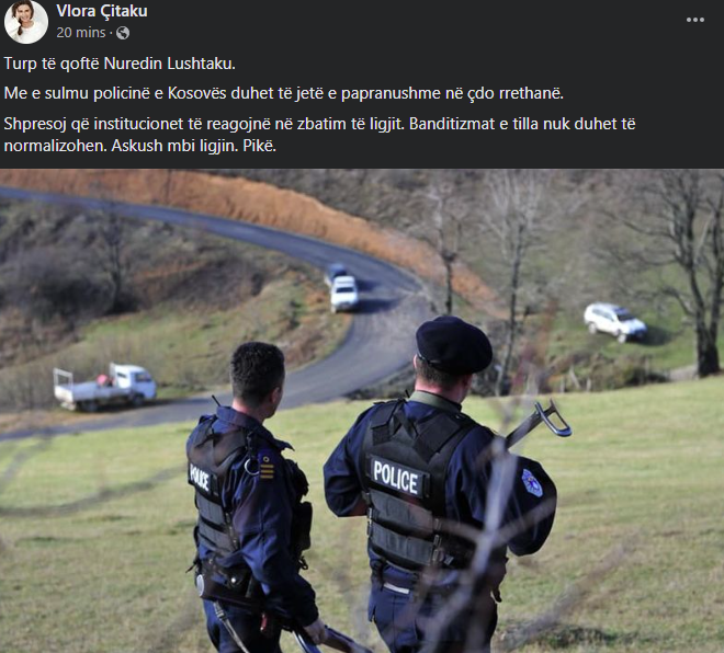 “Turp të qoftë Nuredin Lushtaku. Me e sulmu policinë e Kosovës duhet të jetë e papranushme në çdo rrethanë”, shkroi ajo.