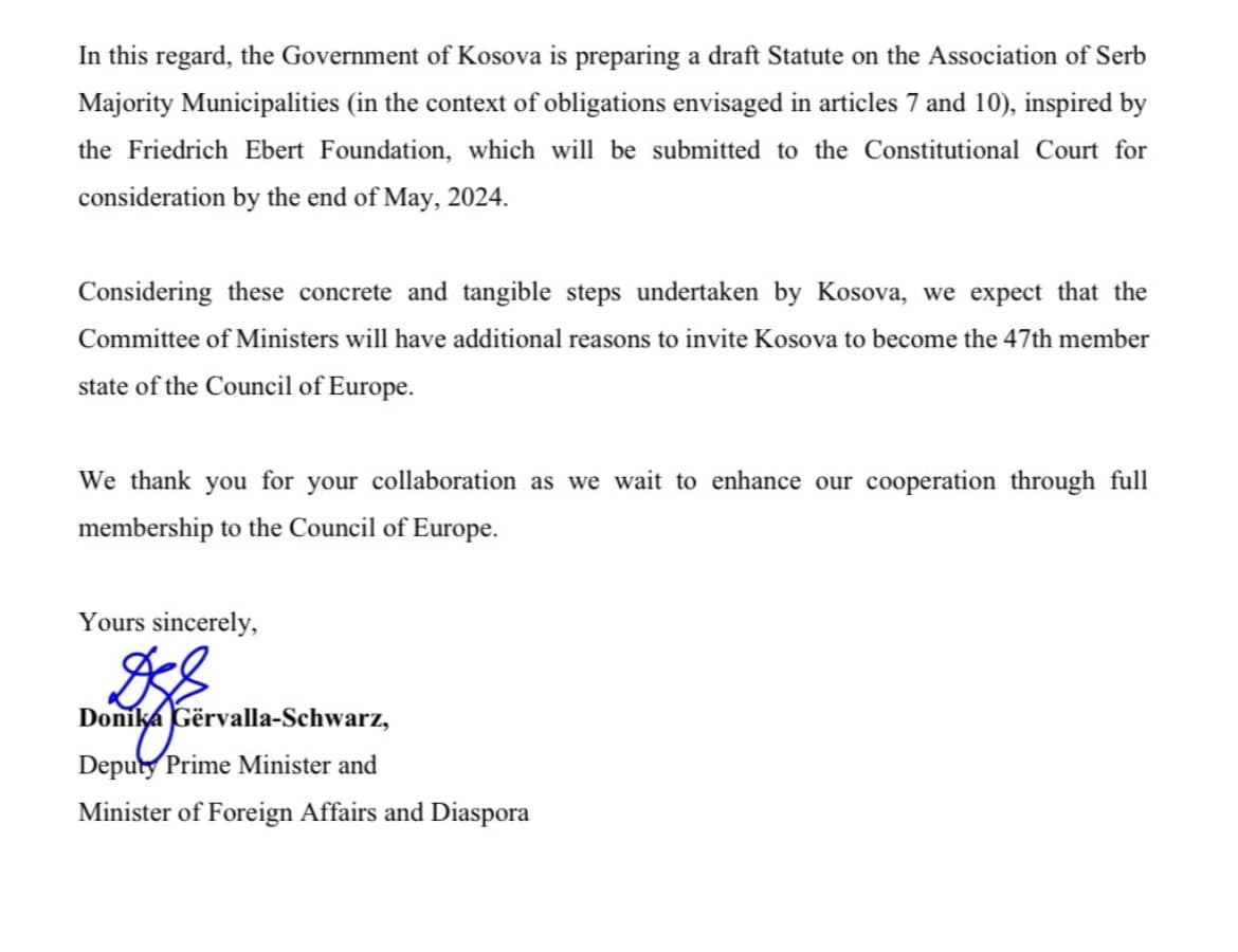 “Në këtë drejtim, Qeveria e Kosovës është duke përgatitur një draft Statut për Asociacionin e Komunave me Shumicë Serbe (në kuadër të obligimeve të parapara në nenet 7 dhe 10), të frymëzuar nga Fondacioni Friedrich Ebert, i cili do t’i dorëzohet Gjykatës Kushtetuese për shqyrtim deri në fund të majit 2024”, shkruan në letrën e kryediplomates kosovare.