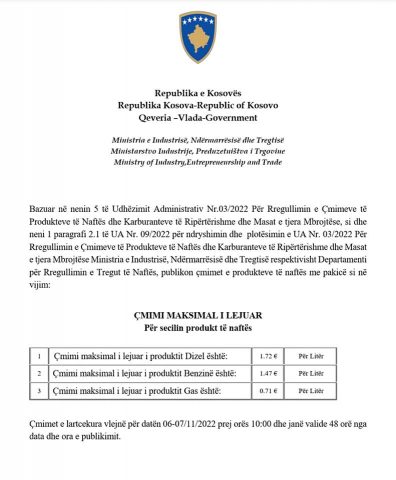 Ndërsa, për Benzinë është 1.47 euro për litër dhe çmimi maksimal i lejuar për produktin Gas është 0.71 euro.
