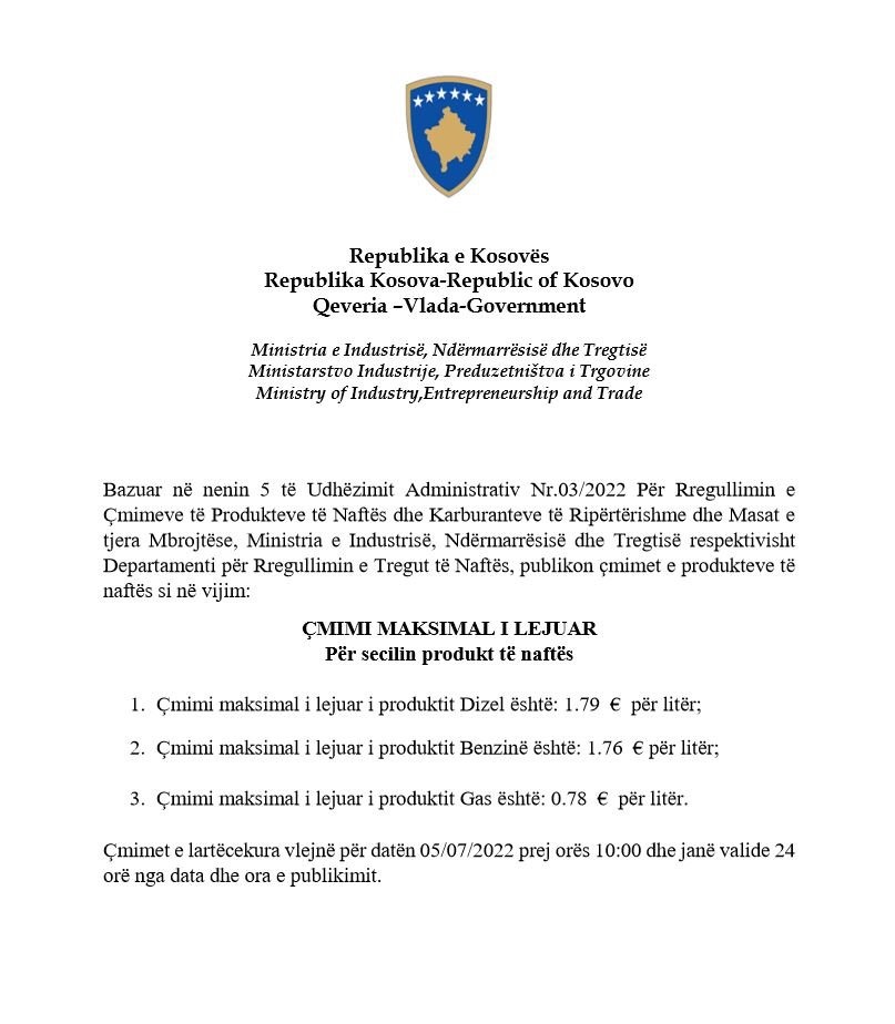 Çmimi maksimal i lejuar për Benzinë është 1.76 Euro për litër.